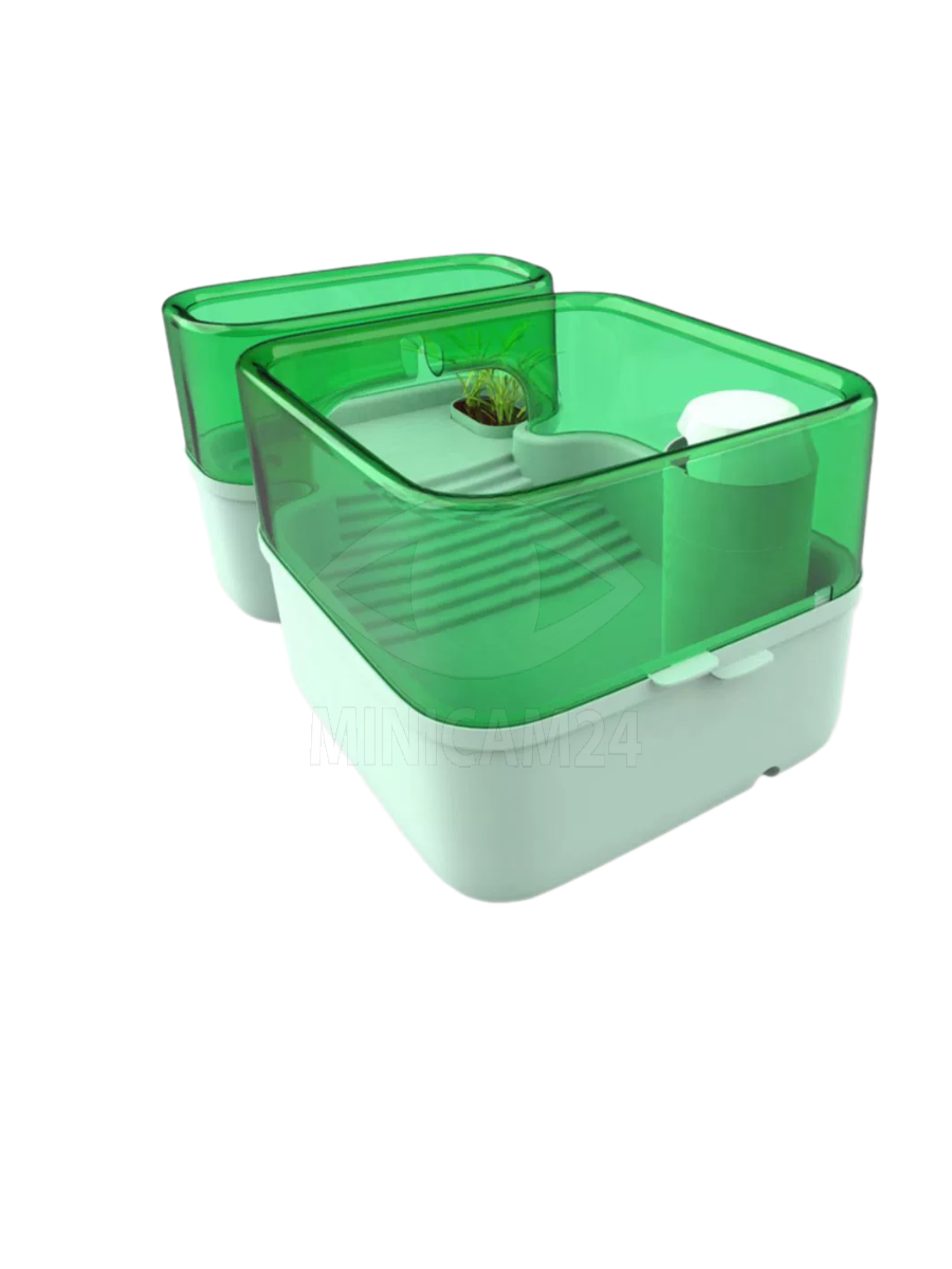 Конструкция террариума включает функциональную перегородку, которая помогает разделить пространство и улучшить фильтрацию воды. Многослойная система разделения гарантирует, что отходы, включая испражнения черепах, аккуратно стекают на дно с потоком воды, обеспечивая чистоту в резервуаре. После использования достаточно поднять верхний слой и открыть слив, что позволяет быстро и удобно промыть аквариум.